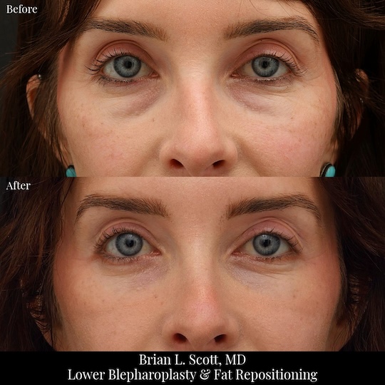 Fat grafting is a procedure to improve hollowing under the eyelids and smooth the junction between the lower eyelid and the cheek. A small amount of fat is removed from the stomach or thigh. The fat is then purified and small amounts are placed in hollowing under the eyes. In some cases, malpositioned eyelid fat bags can be repositioned instead of being completely removed which may make fat grafting unnecessary. Dr. Scott will evaluate you to determine if you would benefit from fat grafting or fat repositioning at the time of your eyelid lift.